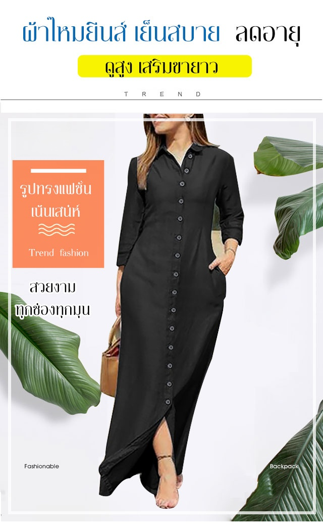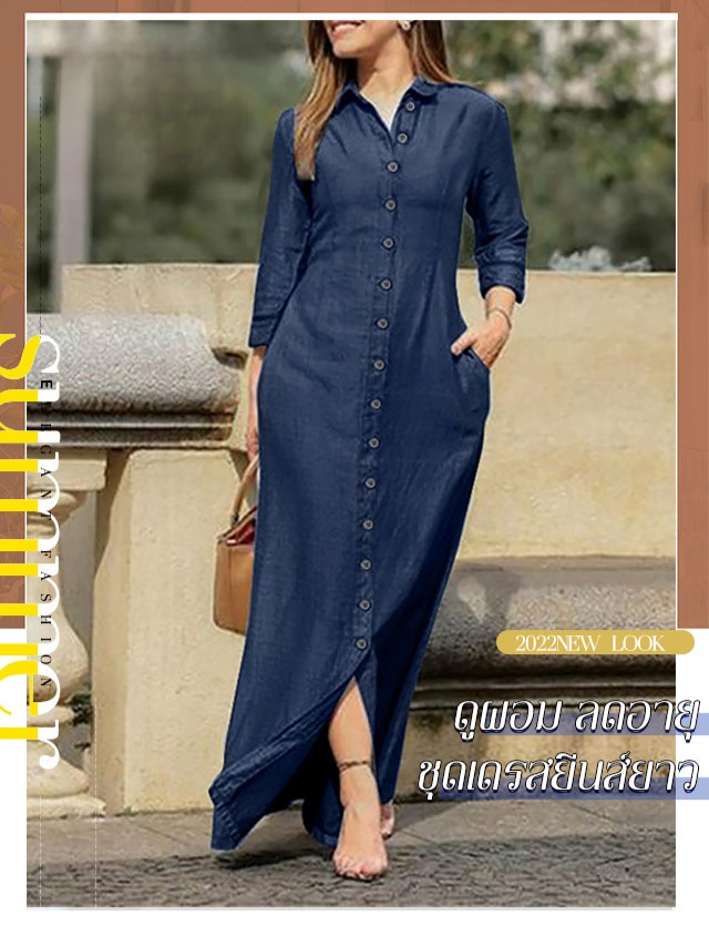 ชุดเดรสยีนส์ยาว ผ้าไหมยีนส์ ใส่สบาย ระบายอากาศ รูปทรงเข้าชุดง่าย จะไปทำงานหรือไปช้อปปิ้ง ใส่ตามใจชอบ เข้าชุดง่าย